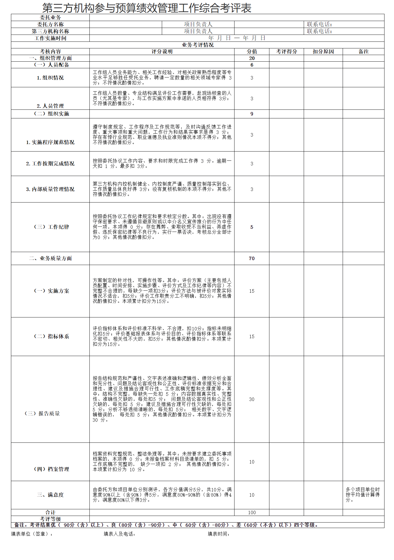(二)综合考评。每个委托事项实施完成后,由委托方会同委托事项项目单位即时填报第三方机构参与预算绩效管理综合考评表(见附件),报送同级财政部门备核。